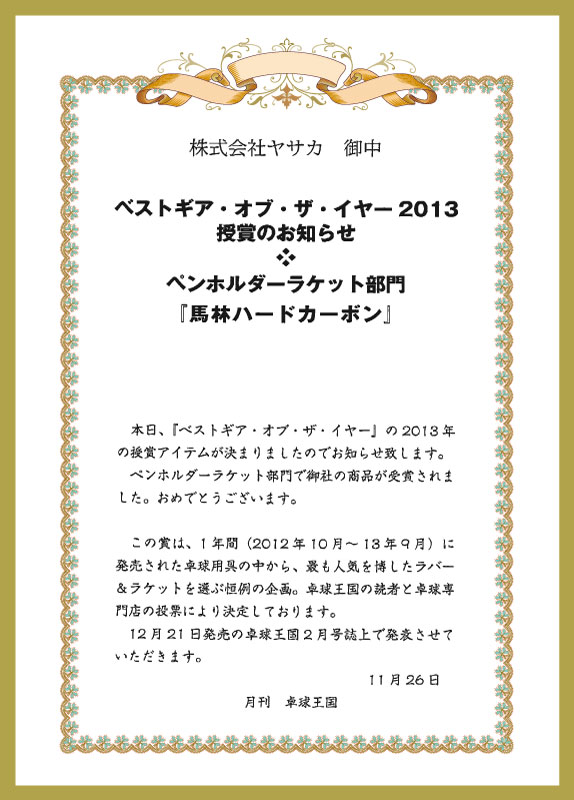 月刊卓球王国誌2月号において、ヤサカの『馬林ハードカーボン』がペンホルダーラケット部門で2013年のベストギア・オブ・ザ・イヤーに輝いたと発表されました。