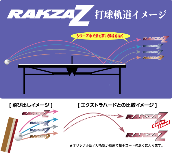 ラクザZエクストラハードはラクザZと同じ粘着性トップシートとハードなスポンジを組み合わせる事で強打でのエネルギーロスが少なくなり、より強烈なスピンのかかった威力あるドライブを放つことが可能です。